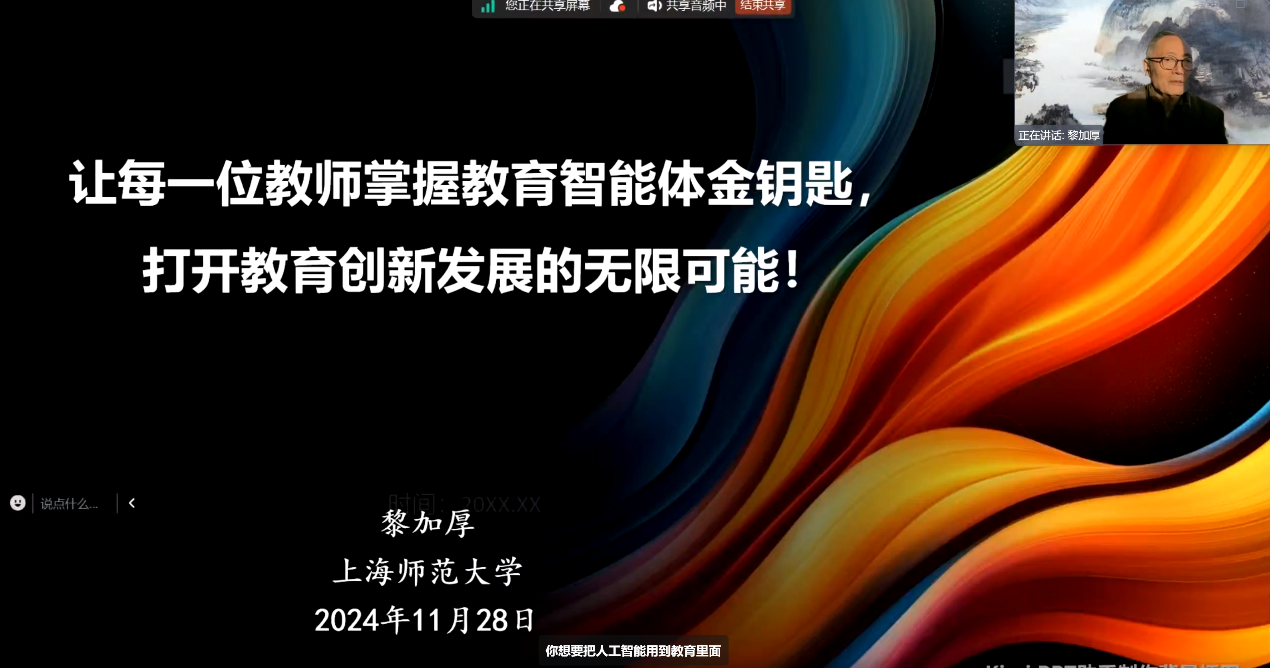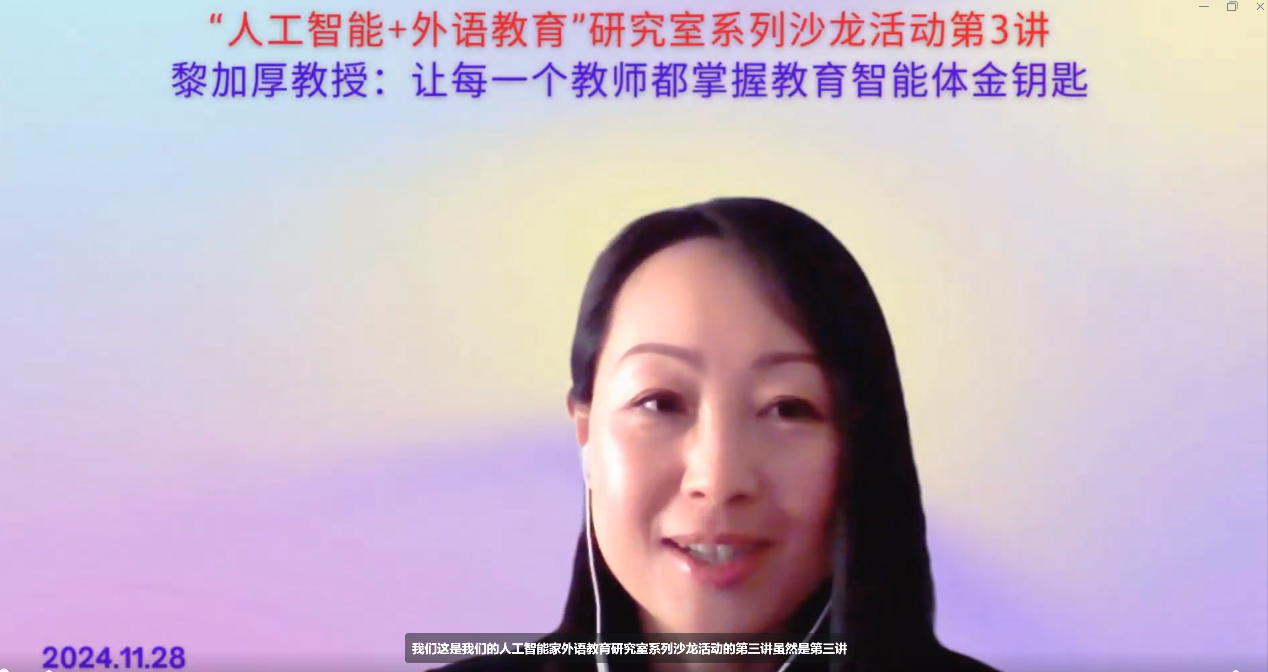 11月28日下午,东瀛竞技官方登录入口“人工智能+外语教育”研究室成功举办了主题为“让每一位教师掌握教育智能体金钥匙:打开教育与创新发展的无限可能”的线上讲座。本讲为研究室系列沙龙活动的第三讲,也是首场特约专家讲座。讲座通过腾讯会议平台举行,东瀛竞技官方登录入口教师、省培学员、外校学者共计100多人在线参与。